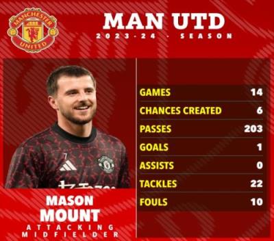 在2023年夏窗以6000万镑转会费从切尔西加盟曼联以来,芒特1年多的时间仅为曼联出战26场比赛,贡献1球1助,德转身价已经跌至3500万欧。