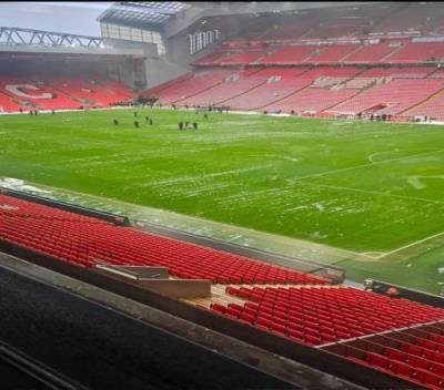 如期进行!记者晒安菲尔德球场现场照,草坪积雪已基本完成清理