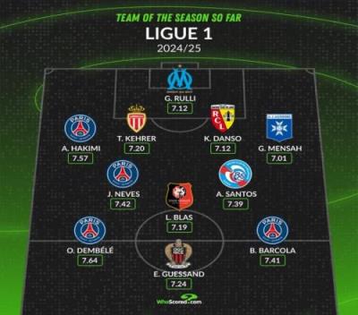 whoscored法甲上半程最佳阵:登贝莱领衔巴黎4将,蓝军租将在列