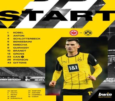马尔穆什缺战!多特客战法兰克福首发:吉拉西、布兰特先发