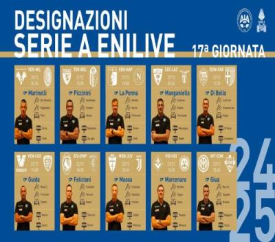 体育资讯12月20日报道宣称 意甲第17轮各场执法裁判公布,马萨执法蒙扎尤文,迪贝洛执法罗马帕尔马。