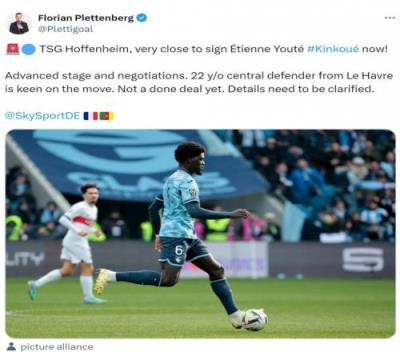 体育资讯8月4日报道宣 据德国天空体育记者普莱滕伯格透露,霍芬海姆接近签下勒阿弗尔中卫尤特-金库。