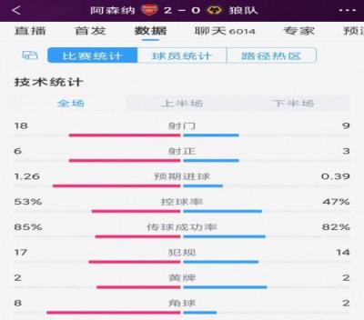 开门红!阿森纳20狼队全场数据:射门189,射正63