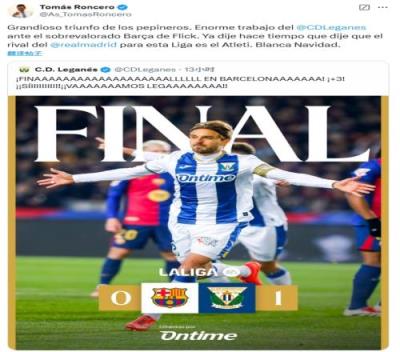 阿斯报主编龙塞罗转发了莱加内斯官推的战报,写道:壮丽的胜利属于小黄瓜队。莱加内斯对被被高估的弗里克领导的巴萨做出了巨大努力。我早就说过,这个赛季皇马的对手是马竞。