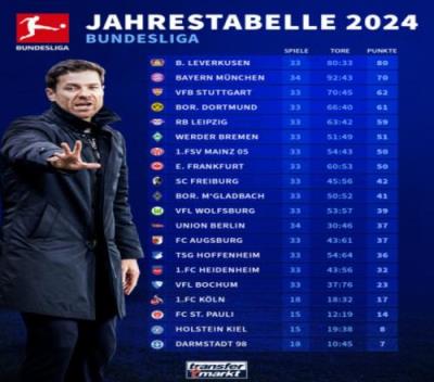 在2024年度德甲积分榜上,勒沃库森以80分居首,他们上赛季以不败战绩夺得冠军,在今年与拜仁的两次交手中拿到4分。