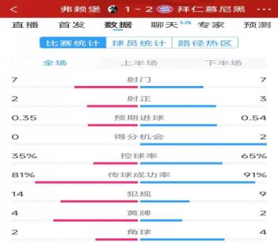 拜仁21弗赖堡全场数据:射门77,射正32,得分机会20