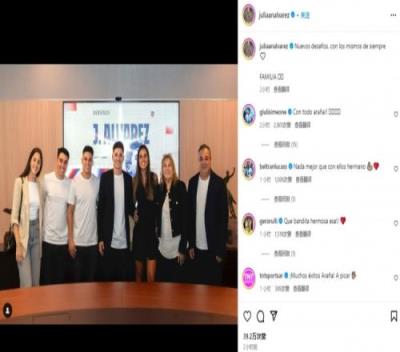 阿尔瓦雷斯晒出自己在家人陪同下在马竞签约的照片,并表示:“新的挑战,但永远和同一帮人一起迎接。家人们。”