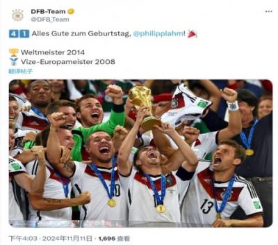 德国队官方社媒晒出拉姆举起大力神杯的照片,配文:“41岁生日快乐,拉姆!2014年世界杯冠军,2008年欧洲杯亚军。”