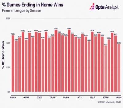 英超本赛季主场球队胜率只39.0%,英超历史上只高于2021赛季