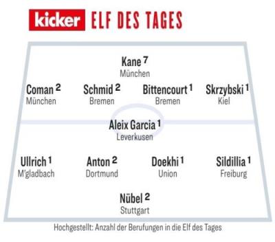 踢球者评本轮德甲最佳阵:凯恩领衔,科曼、努贝尔在列