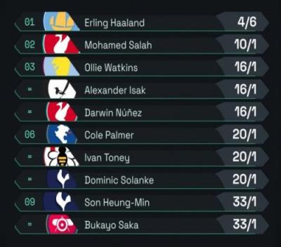 20/1,帕尔默(切尔西)、托尼(布伦特福德)、索兰克(热刺)