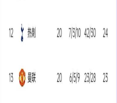 目前英超积分榜上,热刺20轮7胜3平10负积24分排在英超第12,曼联20轮6胜5平9负积23分排在英超第13。