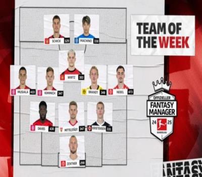 德甲官方本轮最佳阵:穆西亚拉领衔拜仁3将,维尔茨、布兰特在列