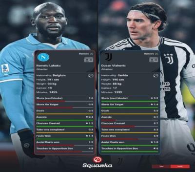 体育资讯1月25日报道宣称 尤文将在本轮意甲焦点战对阵那不勒斯,数据机构squawka则对比了两队中锋的本赛季意甲场均关键数据: