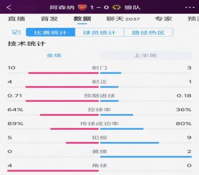 攻势占优!阿森纳vs狼队半场数据:射门103,射正41