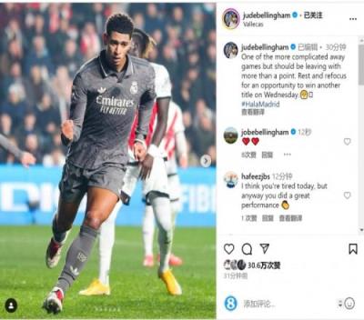 赛后贝林厄姆在社交媒体上晒出比赛照片,并写道:“这是较为艰难的客场比赛之一,但我们应该带着不止一分离开。”