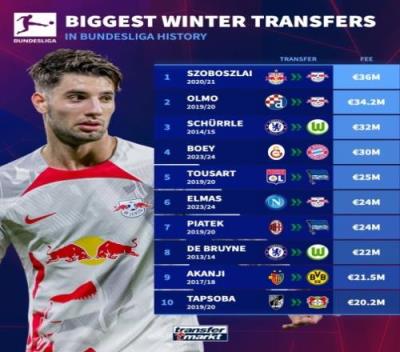 体育资讯1月14日报道宣称 德国转会市场统计了德甲历史上冬窗引援转会费最高的前十名球员,与五大联赛其余联赛相比,德甲的冬窗稍显平淡。其中索博3600万欧居首,奥尔莫3420万欧排在第二。