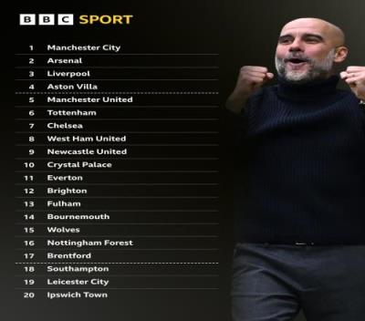 1-5:曼城、阿森纳、利物浦、维拉、曼联