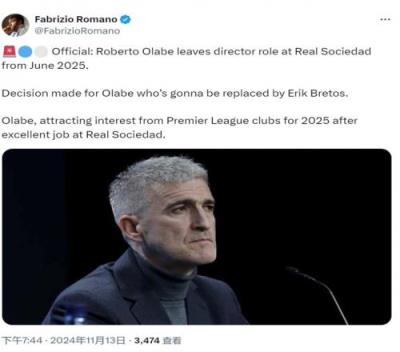 体育资讯11月13日报道宣称 据知名记者罗马诺透露,英超俱乐部都对皇家社会总监奥拉贝感兴趣。
