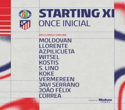 马竞首发:摩尔多万、略伦特、阿斯皮利奎塔、维特塞尔、科斯蒂斯、利诺、科克、维尔梅伦、塞拉诺、菲利克斯、科雷亚