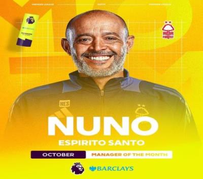 3战2胜1平带队冲进前三!森林主帅努诺当选英超10月最佳教练