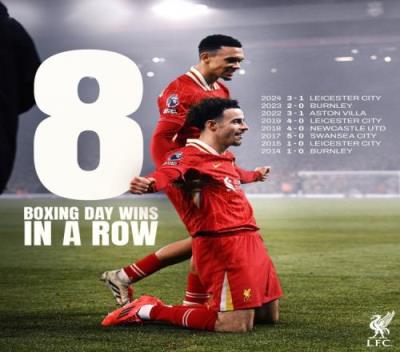 体育资讯12月27日报道宣称 英超第18轮比赛,利物浦主场3-1击败莱斯特城。据利物浦官方统计,利物浦在节礼日的比赛中取得8连胜。