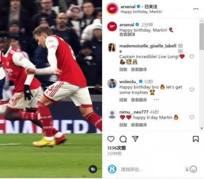 阿森纳官方社媒晒出厄德高精彩表现的集锦视频,配文:“生日快乐,马丁(厄德高)!”