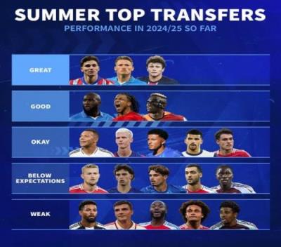体育资讯1月27日报道宣称 本赛季欧陆联赛赛程已经过半,《转会市场》也对去年夏天的重要引援进行了简单评级。