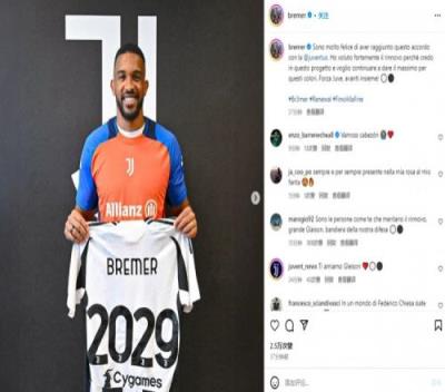 布雷默也通过社媒晒出自己手持续约球衣的照片,并表示:“很高兴能和尤文达成续约协议。我强烈渴望续约,因为我对尤文的计划深信不疑。我想要继续为尤文而竭尽全力。佛砸尤文,让我们一起前进!”