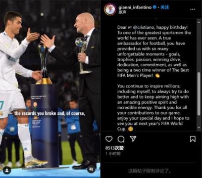 体育资讯2月6日报道宣称 C罗度过了自己40岁的生日,国际足联主席因凡蒂诺也向他送上了生日祝福,表示期待在2026年世界杯中见到C罗。