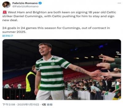 罗马诺指出,西汉姆、布莱顿对丹尼尔-卡明斯感兴趣,有意签下这位18岁的锋线小将,而凯尔特人正在推动球员留队,并签署续约合同。