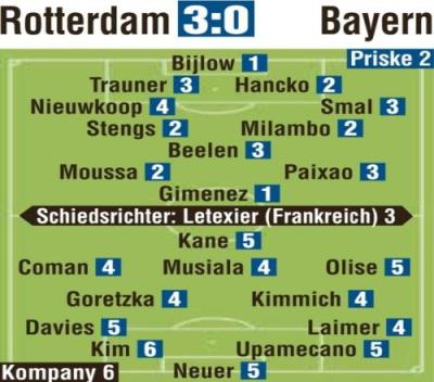 体育资讯1月23日报道宣称 在本轮欧冠,拜仁0-3不敌费耶诺德,《图片报》也为拜仁球员本场做出评分,具体如下(德媒评分1分最高,6分最低):