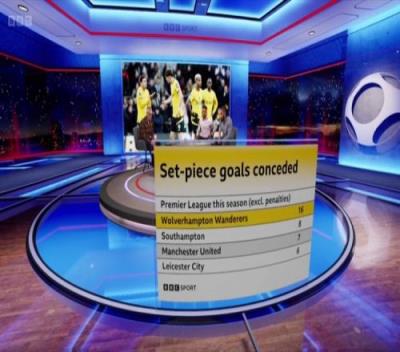 体育资讯12月15日报道宣称 BBC统计了本赛季各队在英超定位球失球的数量,并列出榜单,狼队丢16球居首,南安普顿丢8球,曼联丢7球。