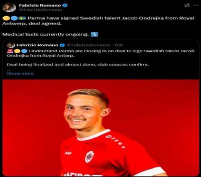 体育资讯1月21日报道宣称 据知名转会专家罗马诺报道,帕尔马已经从安特卫普签下瑞典天才球员翁德雷卡,交易已经完成,球员正在接受体检。