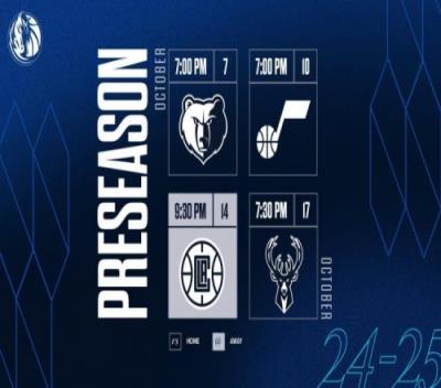 独行侠季前赛赛程:10月8日起先后对阵灰熊、爵士、快船、雄鹿
