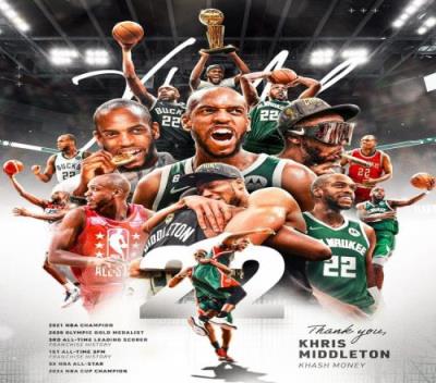 体育资讯2月7日报道宣称 今日,雄鹿官方更新社媒,晒图并配文致敬冠军成员克里斯-米德尔顿。