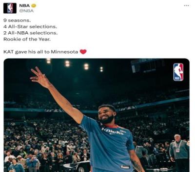 NBA官推配文:“9个赛季,4次全明星,2次最佳阵容,最佳新秀,唐斯把他的一切给了明尼苏达。”