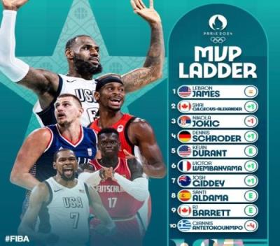 体育资讯8月2日报道宣称 今天,FIBA官网更新了奥运男篮MVP榜,詹姆斯继续领跑,亚历山大反超约基奇来到了第2位。