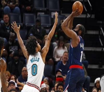 快船也用鲍威尔/哈登+祖巴茨高位挡拆打埃迪防挡拆蹲坑不出,鲍威尔单挡三分手起刀落,哈登挂单挡启动后“卡屁股”在中距离单挑菜鸟韦尔斯。哈登的身板优势低位背打韦尔斯和莫兰特就能吸引夹击,灰熊主动放空琼斯的远射,腾出人手协防化解哈登的低位攻势。