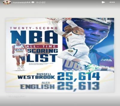 在本场比赛中,威少的常规赛生涯总得分超越名宿阿历克斯-英格利什,升至NBA历史第22位。