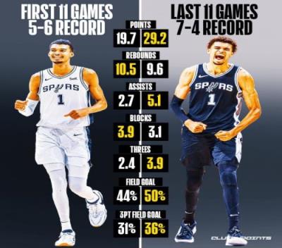 近11场场均29.2分9.6篮板5.1助攻3.1盖帽,场均3.9记三分,投篮命中率50%,三分命中率36%。