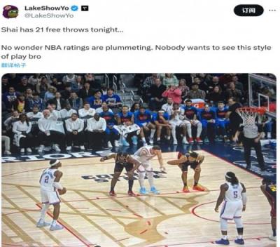 湖人自媒体LakeShowYo发推写道:“亚历山大21个罚球了,难怪NBA收视率在下降,没人想看这种打法,哥们。”