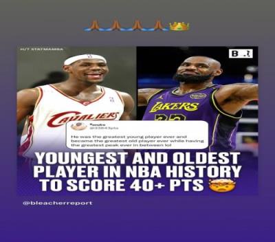 这场比赛过后,詹姆斯(40岁38天)超越乔丹(40岁零4天)成为NBA历史上单场砍下40+最老的球员。