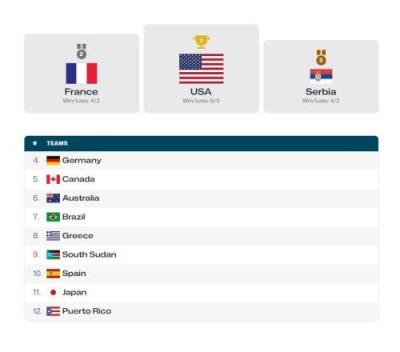 巴黎奥运会男篮最终排名:美国&法国&塞尔维亚前三日本第11