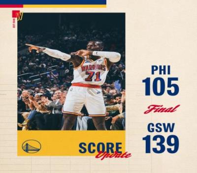 体育资讯1月3日报道宣称 NBA常规赛,勇士139-105大胜76人。
