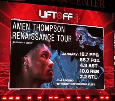 据统计,火箭新星阿门-汤普森在1月场均能砍下18.7分10.6篮板4.3助攻2.2抢断,投篮命中率55.7%。