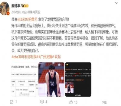 媒体人麦穗丰更博点评道:“好几年前的全运会赛场上,我已经关注到这个福建年轻内线,他长得很阳光帅气,私下喜欢弹吉他,也确实在那年全运会赛场上表现不错,给人留下深刻印象。可惜这几年黄艺在福建男篮的发展不算顺畅,苦苦寻觅各种机会,据我了解,他此前还曾在新疆男篮试训。很高兴看到黄艺如今加盟龙狮男篮,希望他能够在广州把握机会,成为更好的自己。”
