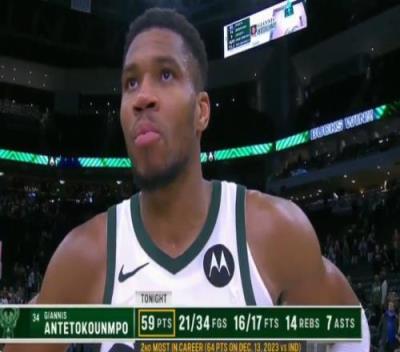 体育资讯11月14日报道宣称 NBA常规赛,雄鹿127-120加时击败活塞,利拉德等球员缺阵,字母哥砍下赛季联盟新高的59分。