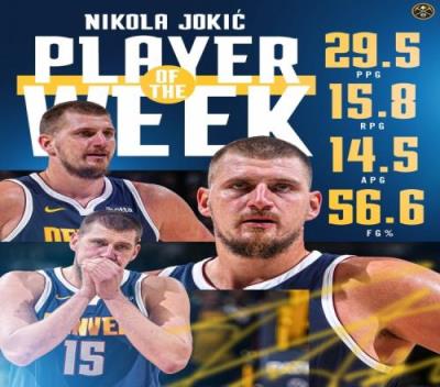 掘金官方晒出约基奇周最佳海报,并配文:“尼科拉(约基奇)绝对的统治力。”