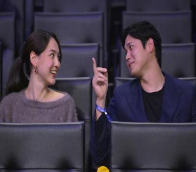 美职棒同城球队洛杉矶道奇球星大谷翔平携妻子田中真美子做客湖人主场,并收到了定制球衣(大谷翔平在道奇穿17号)。